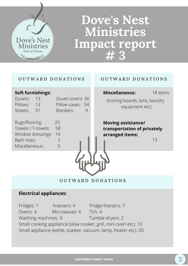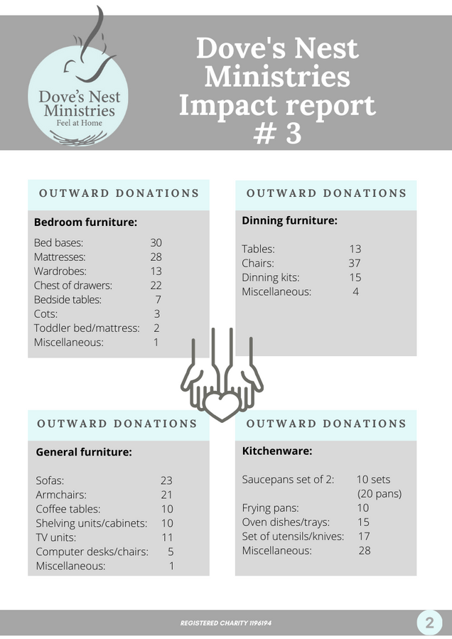 Dove’s Nest Ministries reserves the right to refuse any donation not fit for re-homing. Where the donation is not appropriate for rehoming within Dove’s Nest Ministries but may benefit a partner charity/organisation or acquire funds for the organisation Dove’s Nest Ministries reserves the right to sell the items or donate to partner charities, all proceeds being put back into the Ministries funds to continue its charitable works.